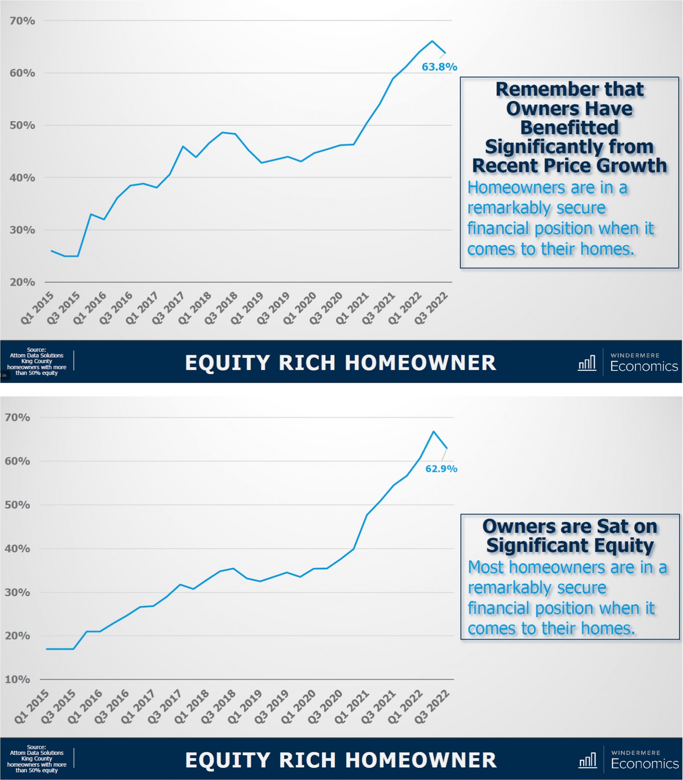 In King County, prices were up 22% in 2021, and in Snohomish County, they were up 23%. We started 2023 with higher prices over 2021, but off the peak of 2022. This is a price reversion, not a housing recession! In fact, in King County, 64% of homeowners with a mortgage have over 50% home equity and in Snohomish County, 63% of homeowners with a mortgage have over 50% home equity. Homeowners are fortified with strong cash positions which is a clear indicator we are nowhere near a housing crisis; we are actually incredibly healthy! While the highs of 2022 were wiped out, the long-term growth we have had over the last decade is the foundation and guiding light of our market. If you bought in 2022, don’t fret, just hold, values will eventually return.